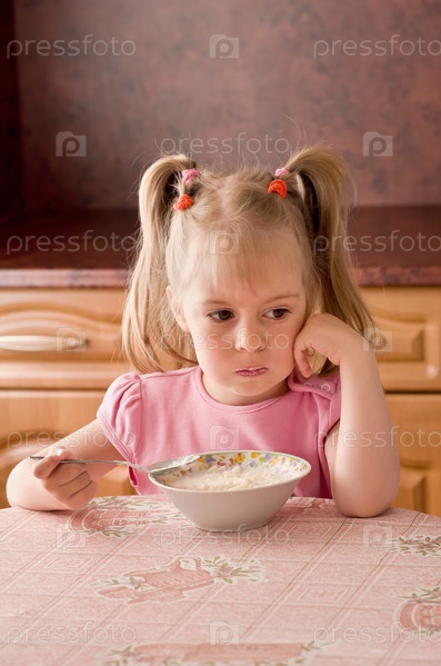 Недовольная девочка ест кашу, сидя за столом