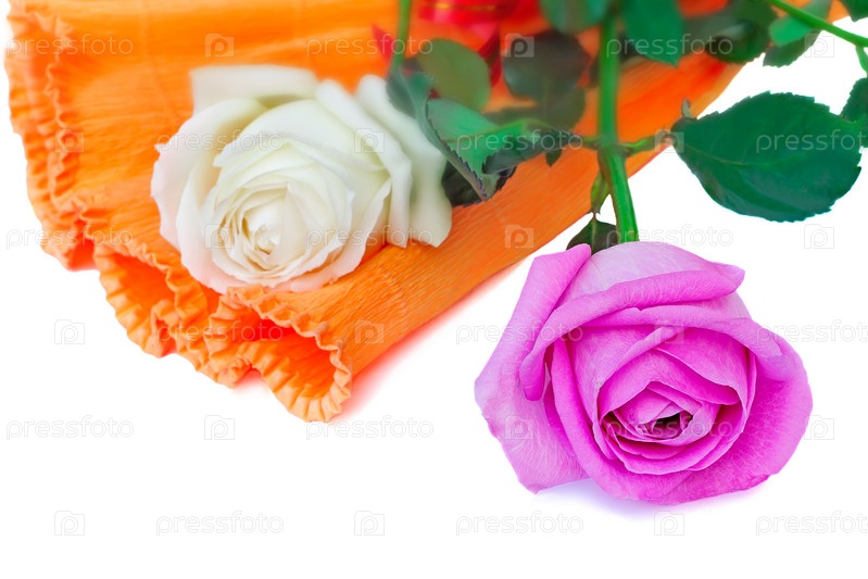 Букет из роз в красивой упаковке на белом фоне