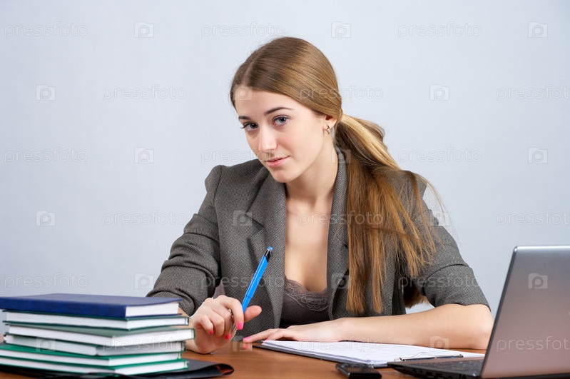 Деловая женщина за рабочим столом с документами и ноутбуком