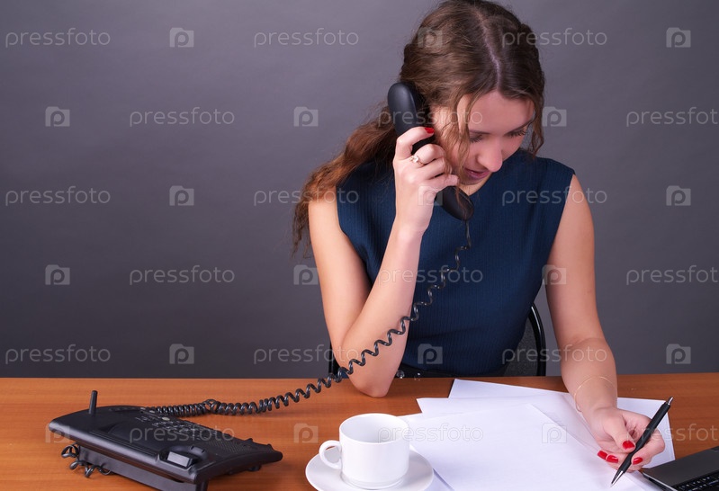 Женщина говорит по телефону и делает записи в офисе