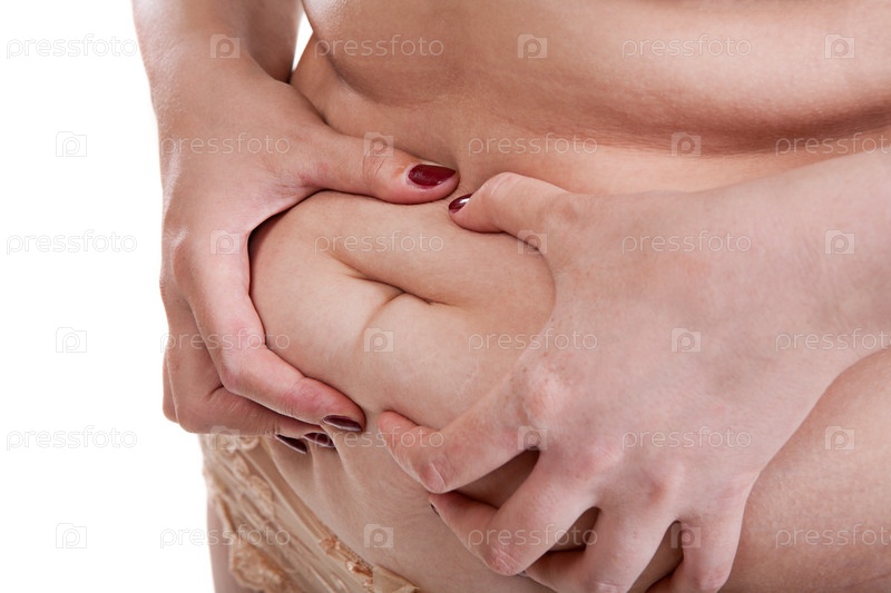 Женщина держит складку жира на полном животе