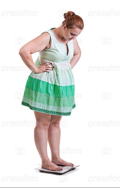 Женщина с ожирением стоит на весах