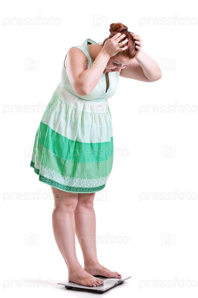 Женщина с ожирением стоит на весах