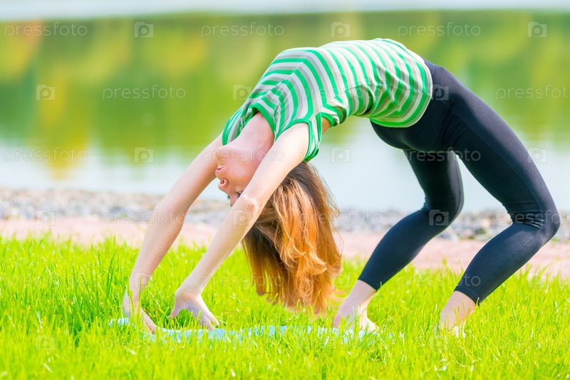Гибкая спортсменка делает "мостик" на природе