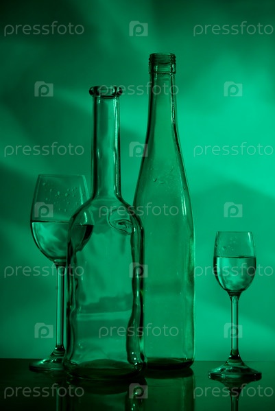 Бутылки и бокалы с прозрачной жидкостью на темно-зеленом фоне