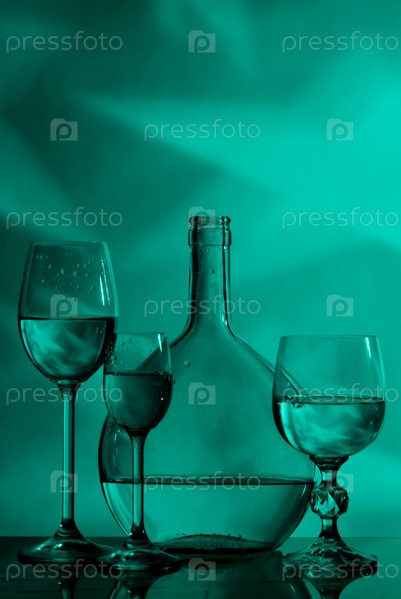 Графин и бокалы с прозрачной жидкостью на темно-зеленом фоне