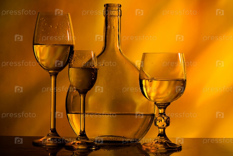 Графин и бокалы с прозрачной жидкостью на темно-оранжевом фоне