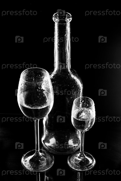 Бутыль и бокалы с жидкостью на черном фоне