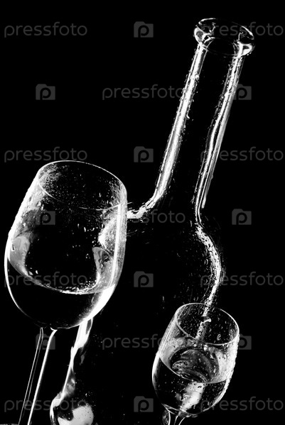 Бутыль и бокалы с жидкостью на черном фоне