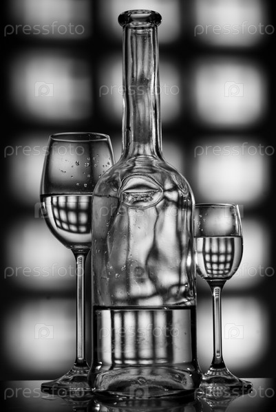 Бутыль и бокалы с прозрачной жидкостью на сером фоне