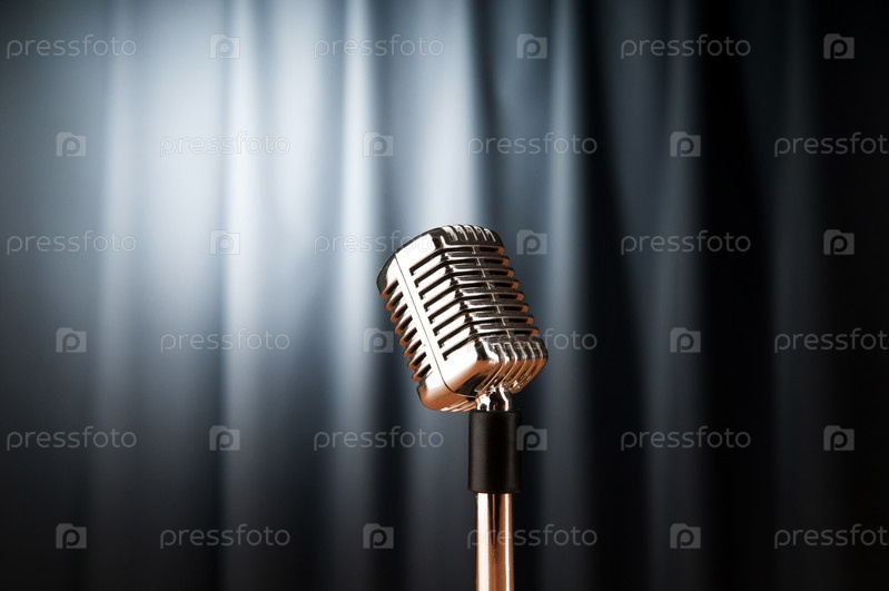 Микрофон на фоне темно-серого занавеса