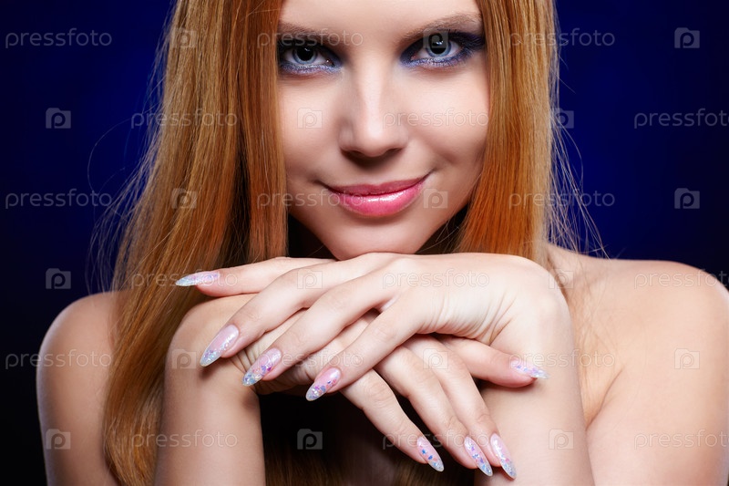 Портрет рыжей голубоглазой девушки на синем фоне