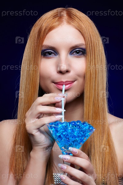 Портрет длинноволосой голубоглазой девушки с коктейлем