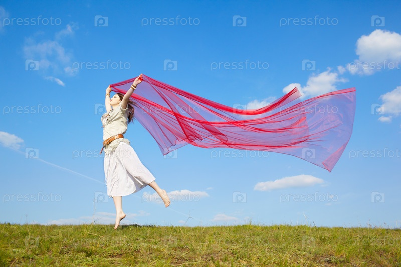 Девушка-хиппи прыгает с куском красной материи на зеленой лужайке