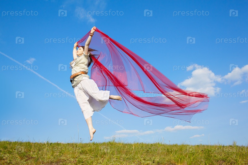 Девушка-хиппи прыгает с куском красной материи на зеленой лужайке