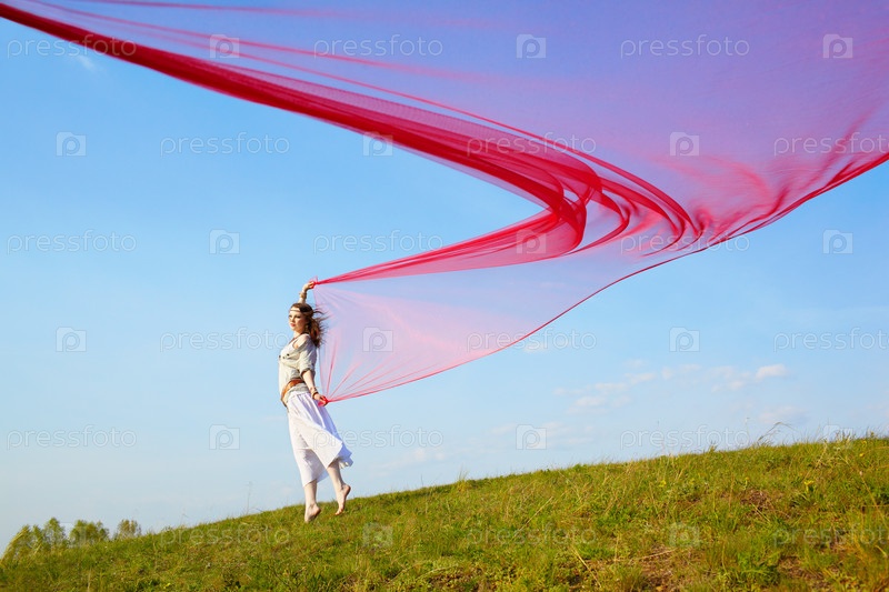 Девушка-хиппи прыгает с куском красной материи на зеленой лужайке