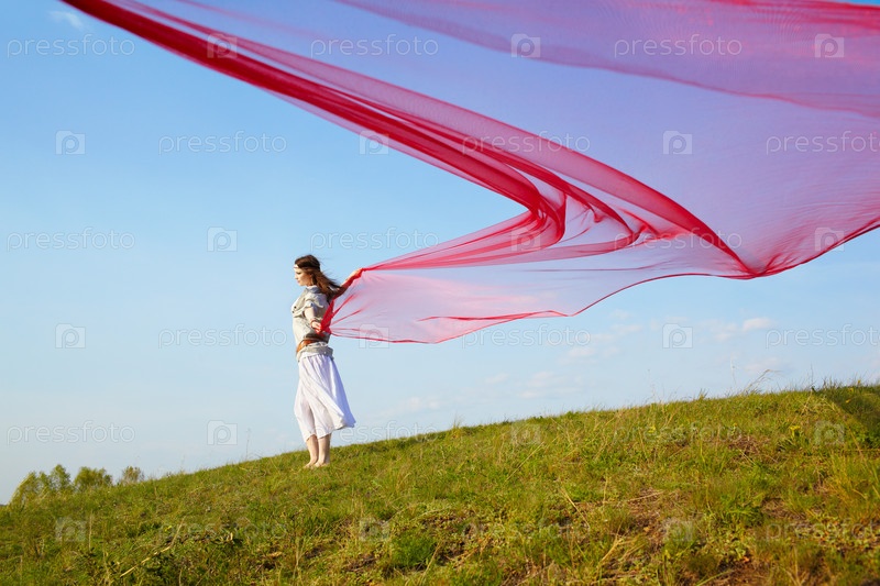 Девушка-хиппи с куском красной материи на зеленой лужайке