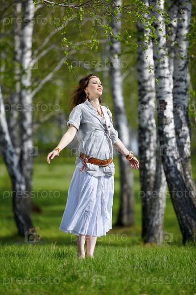 Девушка-хиппи прыгает на зеленой траве в березовом лесу