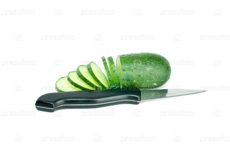 Нарезанный ломтиками огурец и маленький стальной нож, изолированные на белом фоне