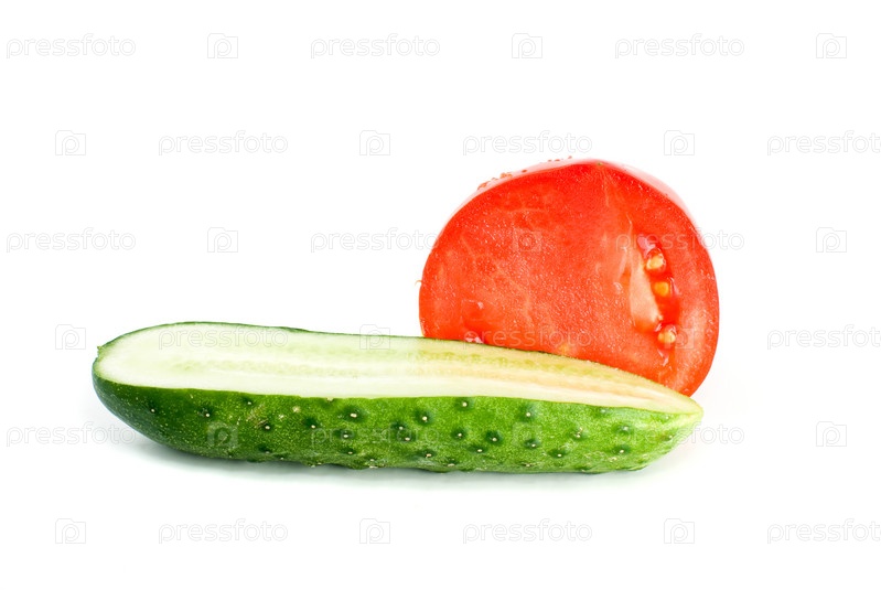 Половинки помидора и огурца на белом фоне