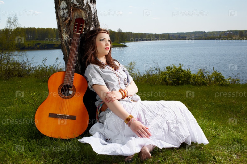 Девушка-хиппи сидит на зеленой траве возле березы с гитарой