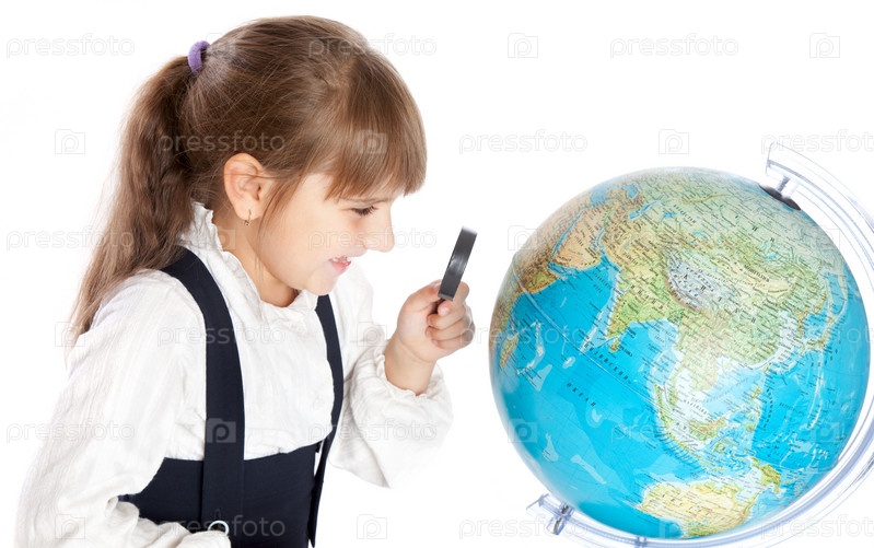Школьница смотрит через лупу на глобус