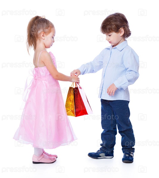 Мальчик дарит подарки девочке, белый фон