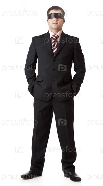 Бизнесмен с завязанными глазами стоит на белом фоне