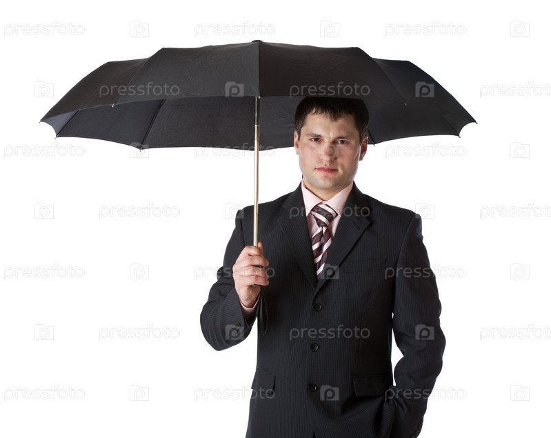 Молодой бизнесмен с черным зонтом на белом фоне