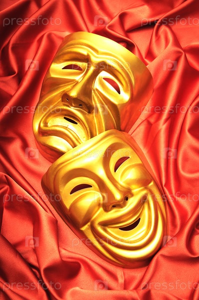 Маски комедии и трагедии на красном атласе