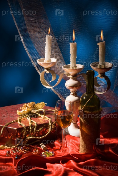 Бутылка и бокал вина, свечи и коробка с подарком - натюрморт на шелковой ткани