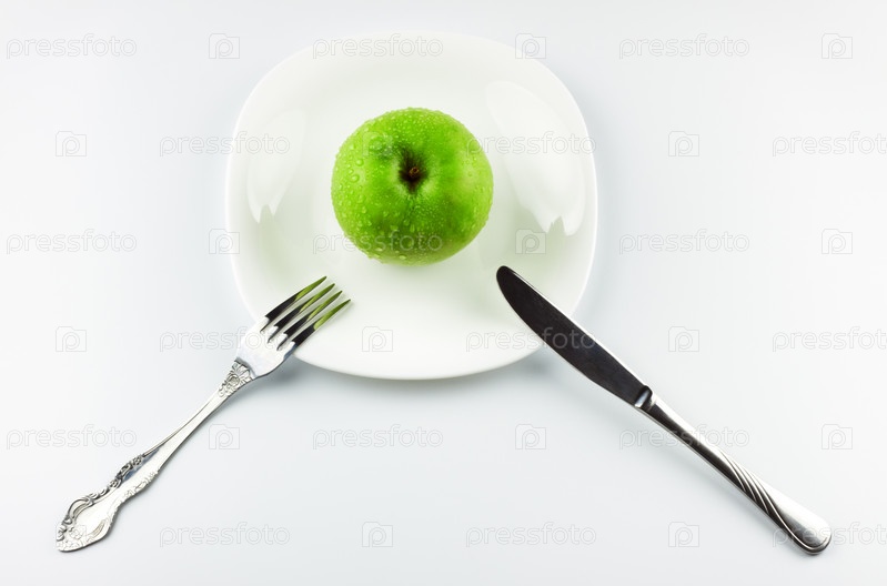 Зеленое яблоко на тарелке с приборами