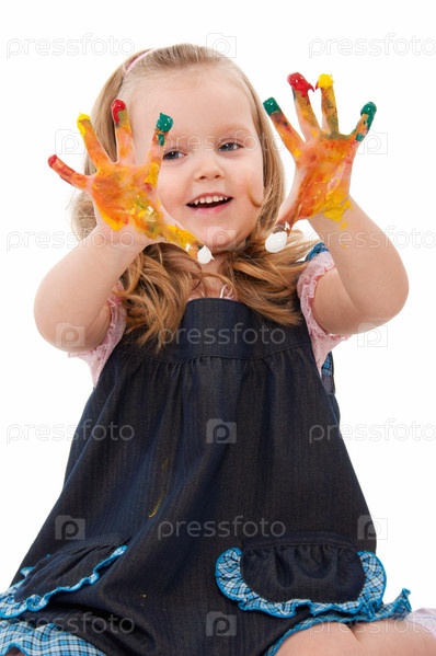 Девочка показывает руки в краске на белом фоне