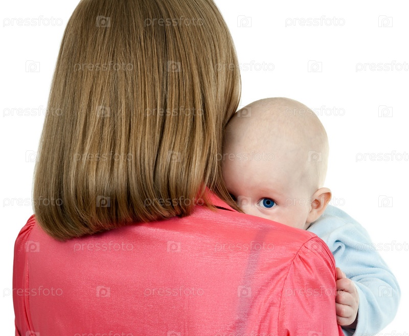 Голубоглазый малыш выглядывает из-за плеча матери, на белом фоне