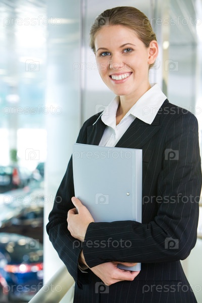Портрет красивой бизнес-леди, стоящей и смотрящей на камеру с улыбкой