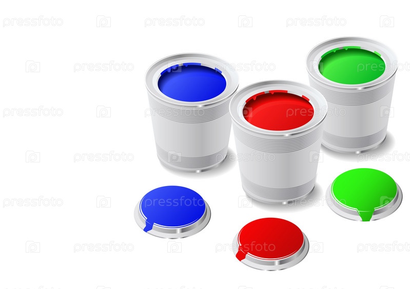Банки с краской на белом фоне