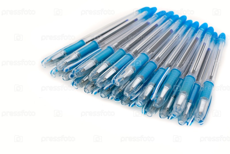 Несколько синих ручек на белом фоне
