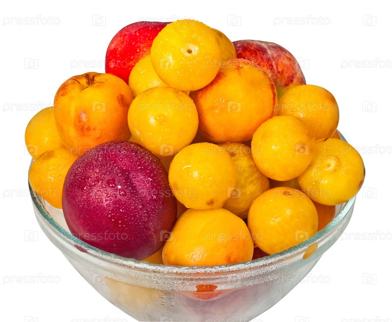 Сливы, персики и абрикосы в миске на белом фоне