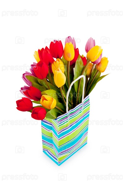 Подарочный пакет с цветами на белом фоне