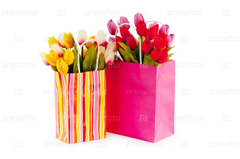 Подарочные пакеты с цветами на белом фоне