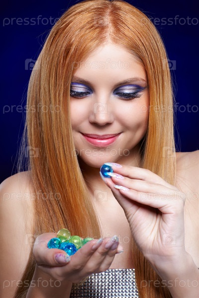 Красивая рыжеволосая девушка с красочными стеклянными шарами в руках