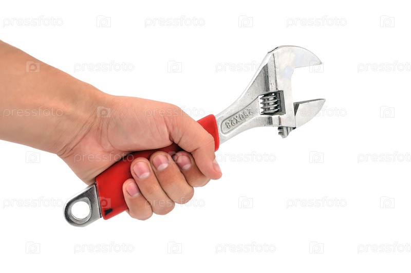 Рука держит гаечный ключ на белом фоне