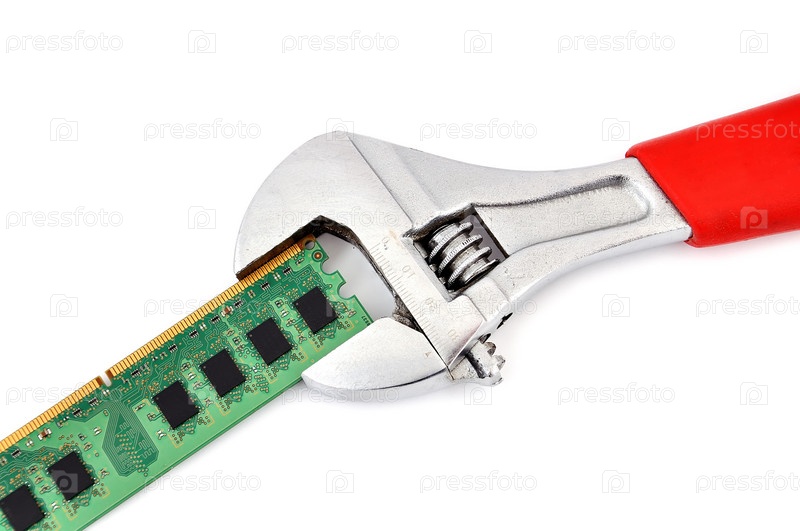 Оперативная память компьютера и гаечный ключ на белом фоне