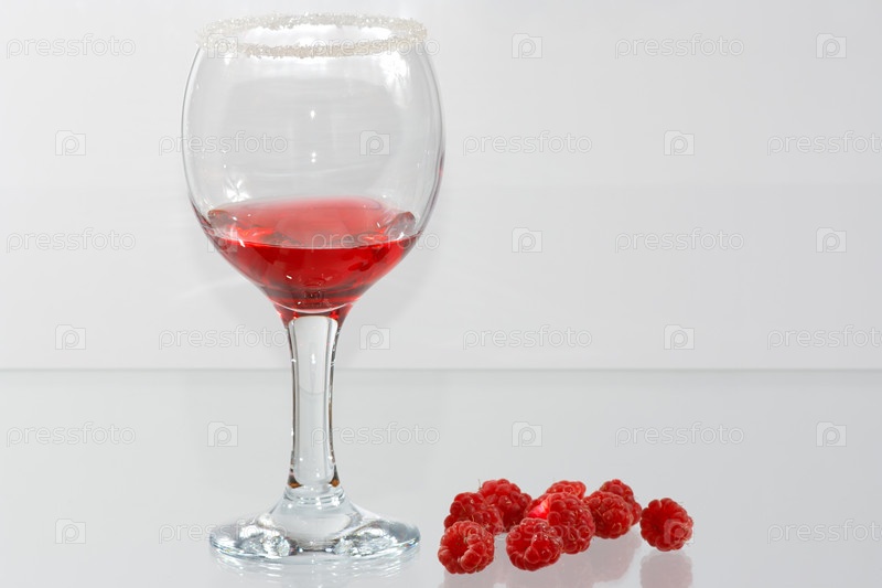 Бокал с красной жидкостью и спелая малина на светлом фоне