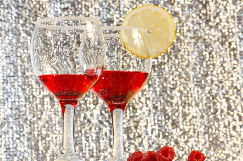 Бокалы с красной жидкостью и спелая малина на блестящем фоне