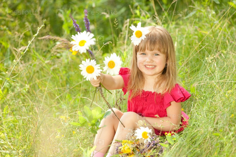 Девочка с букетом полевых цветов на природе