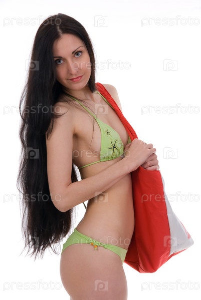 Девушка в бикини с пляжной сумкой, изолирована на белом