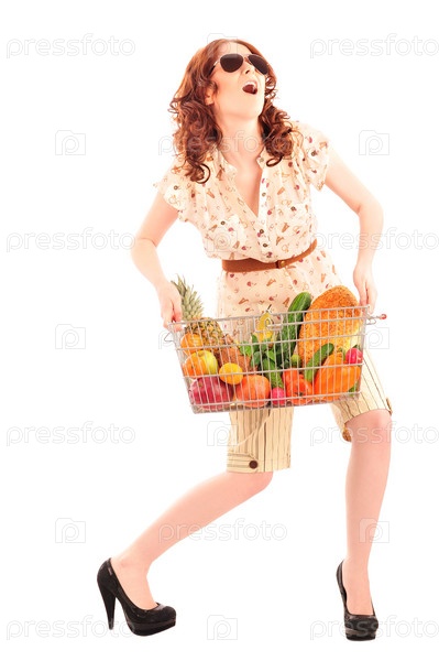 Девушка в темных очках держит в руках корзину с фруктами, овощами и хлебом