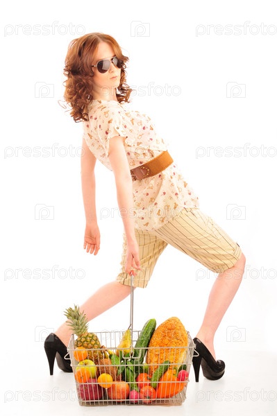 Девушка в темных очках держит в руках корзину с фруктами, овощами и хлебом