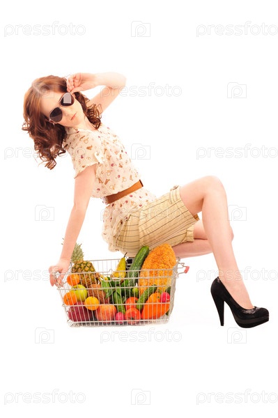 Девушка в темных очках сидит рядом с корзиной с фруктами, овощами и хлебом